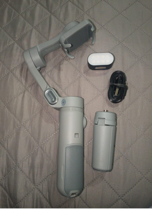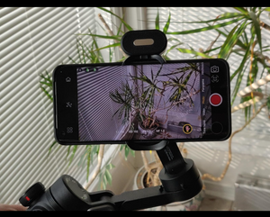 This is a 3-axis gimbal stabiliser for a smartphone with RGB magnetic lights and face tracking feature. There is a supporting mobile app for android or iOS devices.